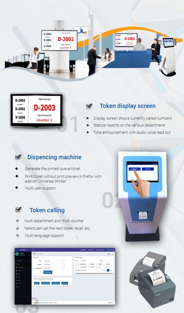 This is a Complete Standard Solution for Kiosk Display with Ticket Generate Option, Counter Display, Staff Counter Control, Admin Panel Along with All Total Control Panel To Management with Complete Standard Reports, Flow on Dashboard, Department Reports, Counter Reports, User Report, Counter On/Off from Admin Panel Etc